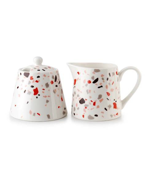 Cukiernica z mlecznikiem TERRAZZO zostały wykonane z wysokiej jakości porcelany. Porcelana to materiał o szlachetnym, eleganckim charakterze, który długo zachowuje ciepło i nie reaguje z żywnością. Produkty nie nadają się do używania w kuchence mikrofalowej oraz w zmywarce.
